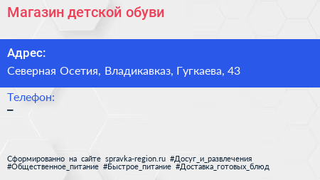 Магазин детской обуви по адресу Северная Осетия, Владикавказ, Гугкаева, 43 в дальнейшем Организация, размещена в следующих категориях: