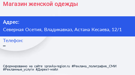 Магазин женской одежды по адресу Северная Осетия, Владикавказ, Астана Кесаева, 12/1 в дальнейшем Организация, размещена в следующих категориях: