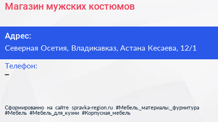 Магазин мужских костюмов по адресу Северная Осетия, Владикавказ, Астана Кесаева, 12/1 в дальнейшем Организация, размещена в следующих категориях: