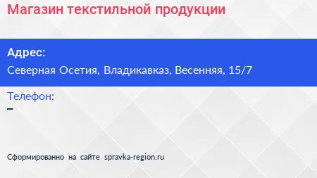 Магазин текстильной продукции по адресу Северная Осетия, Владикавказ, Весенняя, 15/7 в дальнейшем Организация, размещена в следующих категориях: