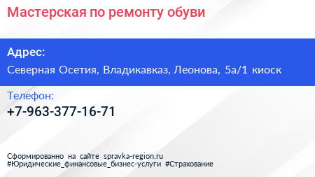 Мастерская по ремонту обуви по адресу Северная Осетия, Владикавказ, Леонова, 5а/1 киоск в дальнейшем Организация, размещена в следующих категориях: