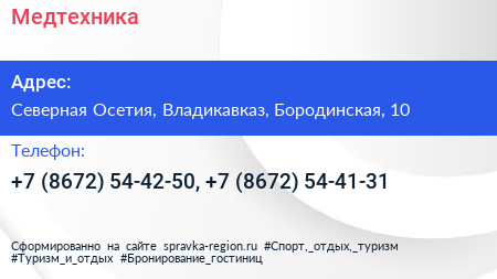 Медтехника по адресу Северная Осетия, Владикавказ, Бородинская, 10 в дальнейшем Организация, размещена в следующих категориях: