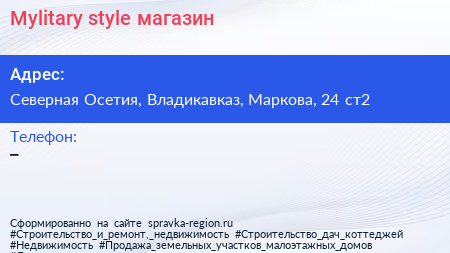 Mylitary style, магазин по адресу Северная Осетия, Владикавказ, Маркова, 24 ст2 в дальнейшем Организация, размещена в следующих категориях: