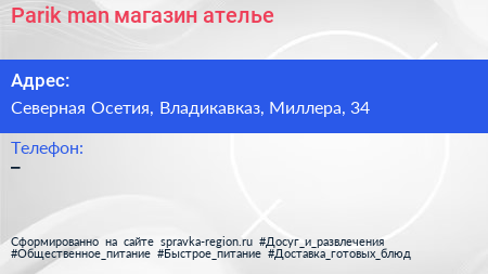 Parik man, магазин-ателье по адресу Северная Осетия, Владикавказ, Миллера, 34 в дальнейшем Организация, размещена в следующих категориях: