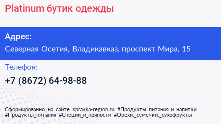 Platinum, бутик одежды по адресу Северная Осетия, Владикавказ, проспект Мира, 15 в дальнейшем Организация, размещена в следующих категориях: