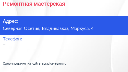 Ремонтная мастерская по адресу Северная Осетия, Владикавказ, Маркуса, 4 в дальнейшем Организация, размещена в следующих категориях: