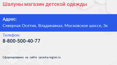 Шалуны, магазин детской одежды по адресу Северная Осетия, Владикавказ, Московское шоссе, 3к в дальнейшем Организация, размещена в следующих категориях:
