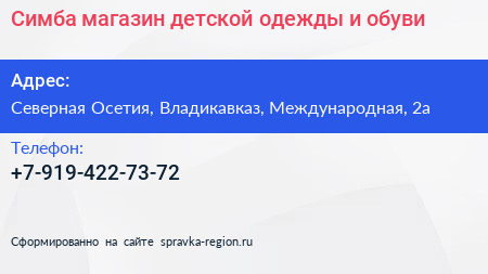 Симба, магазин детской одежды и обуви по адресу Северная Осетия, Владикавказ, Международная, 2а в дальнейшем Организация, размещена в следующих категориях: