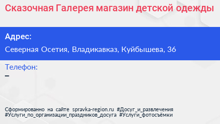 Сказочная Галерея, магазин детской одежды по адресу Северная Осетия, Владикавказ, Куйбышева, 36 в дальнейшем Организация, размещена в следующих категориях:
