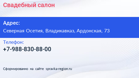 Свадебный салон по адресу Северная Осетия, Владикавказ, Ардонская, 73 в дальнейшем Организация, размещена в следующих категориях: