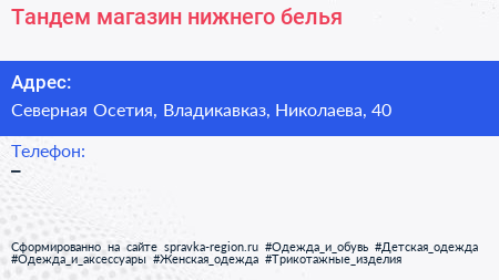 Тандем, магазин нижнего белья по адресу Северная Осетия, Владикавказ, Николаева, 40 в дальнейшем Организация, размещена в следующих категориях: