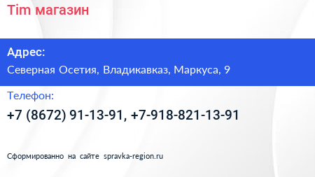 Tim, магазин по адресу Северная Осетия, Владикавказ, Маркуса, 9 в дальнейшем Организация, размещена в следующих категориях: