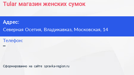 Tular, магазин женских сумок по адресу Северная Осетия, Владикавказ, Московская, 14 в дальнейшем Организация, размещена в следующих категориях: