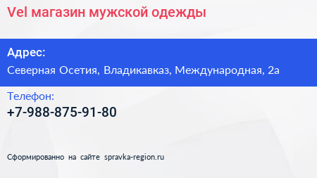 Vel, магазин мужской одежды по адресу Северная Осетия, Владикавказ, Международная, 2а в дальнейшем Организация, размещена в следующих категориях: