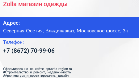Zolla, магазин одежды по адресу Северная Осетия, Владикавказ, Московское шоссе, 3к в дальнейшем Организация, размещена в следующих категориях: