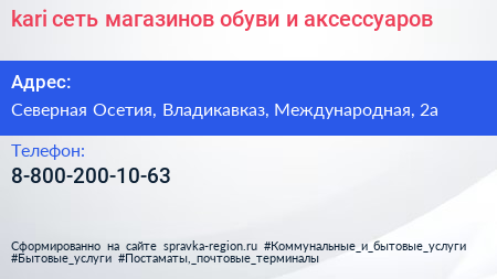 kari, сеть магазинов обуви и аксессуаров по адресу Северная Осетия, Владикавказ, Международная, 2а в дальнейшем Организация, размещена в следующих категориях: