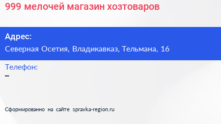 999 мелочей, магазин хозтоваров по адресу Северная Осетия, Владикавказ, Тельмана, 16 в дальнейшем Организация, размещена в следующих категориях: