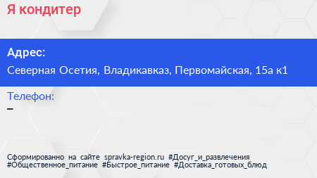 Я кондитер по адресу Северная Осетия, Владикавказ, Первомайская, 15а к1 в дальнейшем Организация, размещена в следующих категориях: