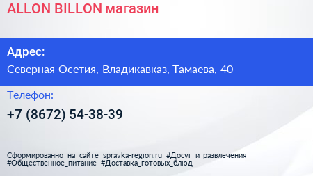 ALLON BILLON, магазин по адресу Северная Осетия, Владикавказ, Тамаева, 40 в дальнейшем Организация, размещена в следующих категориях: