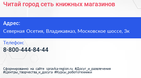 Читай-город, сеть книжных магазинов по адресу Северная Осетия, Владикавказ, Московское шоссе, 3к в дальнейшем Организация, размещена в следующих категориях: