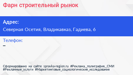 Фарн, строительный рынок по адресу Северная Осетия, Владикавказ, Гадиева, 6 в дальнейшем Организация, размещена в следующих категориях:
