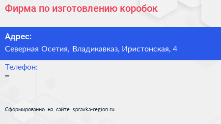 Фирма по изготовлению коробок по адресу Северная Осетия, Владикавказ, Иристонская, 4 в дальнейшем Организация, размещена в следующих категориях: