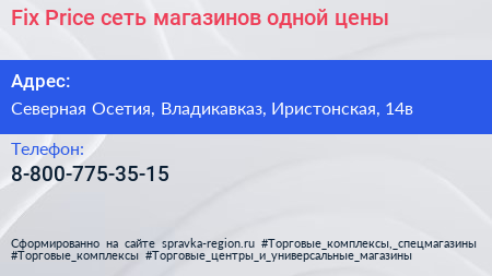 Fix Price, сеть магазинов одной цены по адресу Северная Осетия, Владикавказ, Иристонская, 14в в дальнейшем Организация, размещена в следующих категориях: