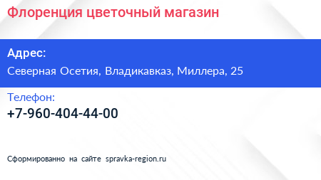 Флоренция, цветочный магазин по адресу Северная Осетия, Владикавказ, Миллера, 25 в дальнейшем Организация, размещена в следующих категориях: