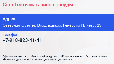 Gipfel, сеть магазинов посуды по адресу Северная Осетия, Владикавказ, Генерала Плиева, 23 в дальнейшем Организация, размещена в следующих категориях: