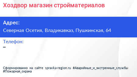 Хоздвор, магазин стройматериалов по адресу Северная Осетия, Владикавказ, Пушкинская, 64 в дальнейшем Организация, размещена в следующих категориях: