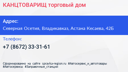КАНЦТОВАРИЩ, торговый дом по адресу Северная Осетия, Владикавказ, Астана Кесаева, 42Б в дальнейшем Организация, размещена в следующих категориях: