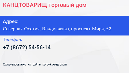 КАНЦТОВАРИЩ, торговый дом по адресу Северная Осетия, Владикавказ, проспект Мира, 52 в дальнейшем Организация, размещена в следующих категориях: