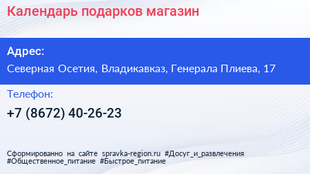 Календарь подарков, магазин по адресу Северная Осетия, Владикавказ, Генерала Плиева, 17 в дальнейшем Организация, размещена в следующих категориях: