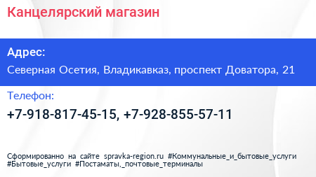 Канцелярский магазин по адресу Северная Осетия, Владикавказ, проспект Доватора, 21 в дальнейшем Организация, размещена в следующих категориях: