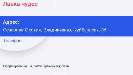 Лавка чудес по адресу Северная Осетия, Владикавказ, Куйбышева, 36 в дальнейшем Организация, размещена в следующих категориях: