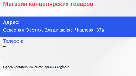 Магазин канцелярских товаров по адресу Северная Осетия, Владикавказ, Чкалова, 37а в дальнейшем Организация, размещена в следующих категориях: