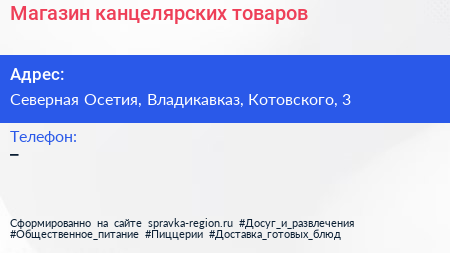 Магазин канцелярских товаров по адресу Северная Осетия, Владикавказ, Котовского, 3 в дальнейшем Организация, размещена в следующих категориях: