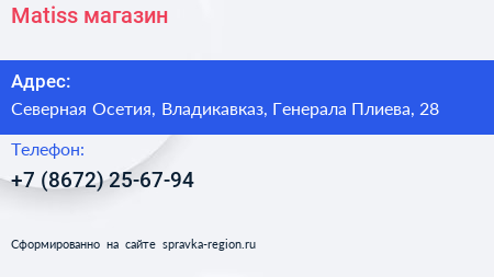 Matiss, магазин по адресу Северная Осетия, Владикавказ, Генерала Плиева, 28 в дальнейшем Организация, размещена в следующих категориях: