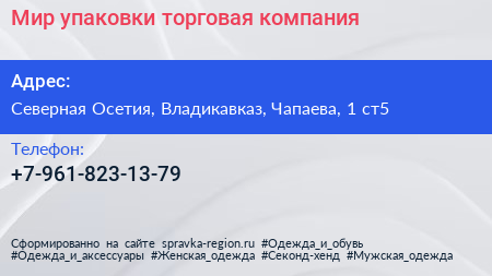 Мир упаковки, торговая компания по адресу Северная Осетия, Владикавказ, Чапаева, 1 ст5 в дальнейшем Организация, размещена в следующих категориях: