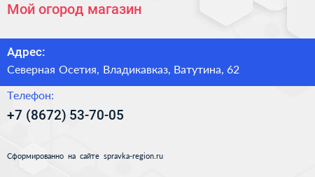 Мой огород, магазин по адресу Северная Осетия, Владикавказ, Ватутина, 62 в дальнейшем Организация, размещена в следующих категориях: