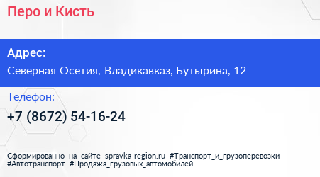 Перо и Кисть по адресу Северная Осетия, Владикавказ, Бутырина, 12 в дальнейшем Организация, размещена в следующих категориях: