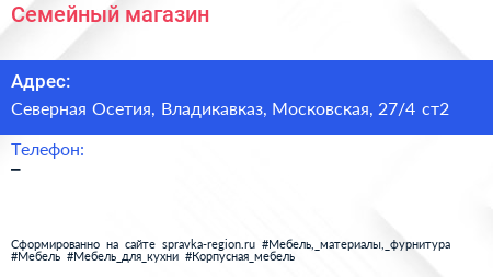 Семейный, магазин по адресу Северная Осетия, Владикавказ, Московская, 27/4 ст2 в дальнейшем Организация, размещена в следующих категориях: