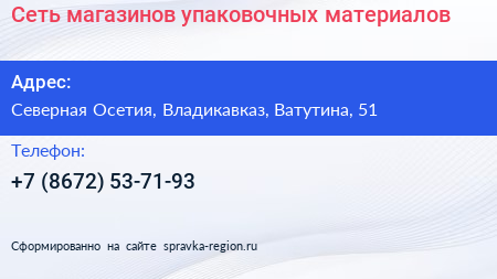 Сеть магазинов упаковочных материалов по адресу Северная Осетия, Владикавказ, Ватутина, 51 в дальнейшем Организация, размещена в следующих категориях: