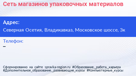 Сеть магазинов упаковочных материалов по адресу Северная Осетия, Владикавказ, Московское шоссе, 3к в дальнейшем Организация, размещена в следующих категориях: