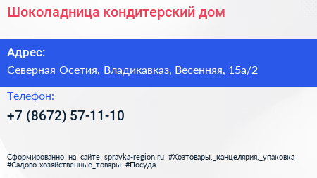 Шоколадница, кондитерский дом по адресу Северная Осетия, Владикавказ, Весенняя, 15а/2 в дальнейшем Организация, размещена в следующих категориях: