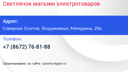 Светлячок, магазин электротоваров по адресу Северная Осетия, Владикавказ, Мичурина, 20а в дальнейшем Организация, размещена в следующих категориях: