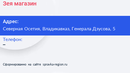 Зея, магазин по адресу Северная Осетия, Владикавказ, Генерала Дзусова, 5 в дальнейшем Организация, размещена в следующих категориях: