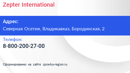 Zepter International по адресу Северная Осетия, Владикавказ, Бородинская, 2 в дальнейшем Организация, размещена в следующих категориях: