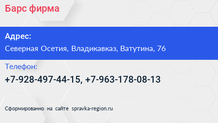 Барс, фирма по адресу Северная Осетия, Владикавказ, Ватутина, 76 в дальнейшем Организация, размещена в следующих категориях: