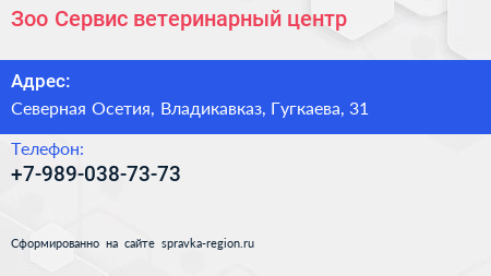 Зоо Сервис, ветеринарный центр по адресу Северная Осетия, Владикавказ, Гугкаева, 31 в дальнейшем Организация, размещена в следующих категориях: